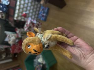 Description: Tan and orange monkey with blue ribbon and bell tied around neck sawdust filled from the 1950s