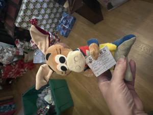 Description: Brown & blue donkey with red & yellow vest made in Japan sawdust filled carnival prize from the 1950s