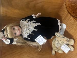 Description: Porcelain doll with black beaded dress, long blonde hair