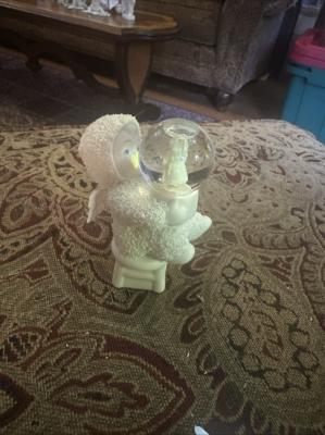 Description: Department 56 snow babies sitting on a stool holding a snow globe with an angel in it