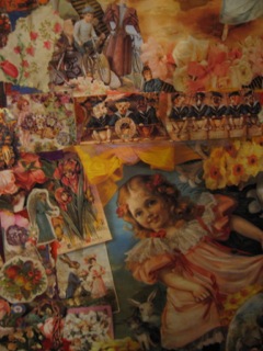 A three panel room divider is covered in paper cut-outs of all variety of nostalgic images. Overlapped edges, no wasted space, and always a different image to discover; Stars Too has this on display in their pink room just past the register.