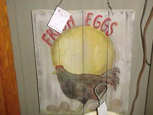 Description: A nice wood painted sign with a chicken and the title FRESH EGGS. A country sign that is perfect for a primitive country décor. Come see all the primitive and country items in space #46 at Stars next to the front counter.