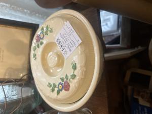 Description: Cream color dish with lid, pink blue flowers with green leaves