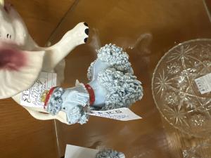1950 blue French porcelain poodle with spaghetti trim, wearing beret