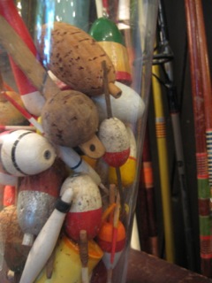 Stars Too has a large glass vase filled with vintage fishing floats and fishing rods tucked behind along the wall. Not only a great play of color and pattern to dazzle the eye, but change the look with a simple turn of the vase.