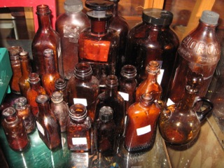 An open bead board wall cupboard gets attention when filled with dozens of jars filled with like items. Dealer #60 has game pieces, hardware, sewing notions, and more in an organized display of recycled jam jars!