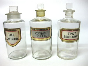 Apothecary bottles have become a big decorating hit. We would buy all three of them to group on a library shelf. Groups of three or more just make a bigger visual statement. Dealer 55 has these bottles for $32 each