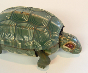 This charming toy tin turtle is a winner with us. Made in Japan, this turtle wants to be adopted and loved. Priced at $25.00