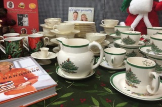 Several Holiday patterns in plates as well as cookbooks overflow across the dining table. Available from Dealer #86.