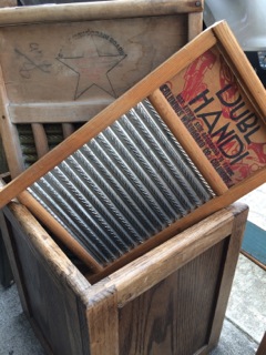 Vintage washboards fill a bucket from Dealer #72. Great collection option from days gone by.