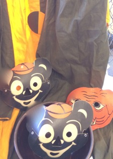 Placed with a clown costume, Dealer #25 has vintage masks that are 3-dimensional paper.