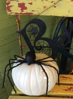 A large black spider rests on a gourd on a chippy bistro chair from Dealer #74.