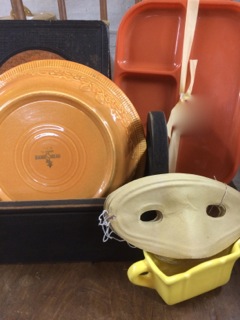 Dealer #46 has a wooden carrier with vintage masks and plates.