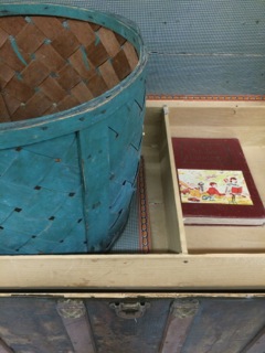 Dealer #95 shows off the interior of a weathered trunk and adds bursts of color and texture in an old book and woven harvest basket.