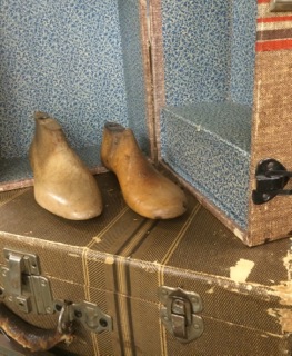 Vintage shoe forms fill the interior of two vintage travel cases from Dealer #46.