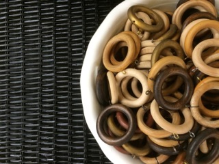 Dealer #82 shows off a bowl brimming with wooden drapery hoops which rests on a glossy black wicker side table.