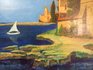 The water, ships, and town are an intrigue for travel and exploration in this canvas from Dealer #61.