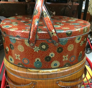 Dealer #72 has great patterns in tin carriers stacked in her space! Update the brown bag lunch with one of these decorative tins.