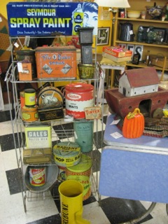 A colorful vignette, Dealer #69 has this collection of tins on a vintage display rack.