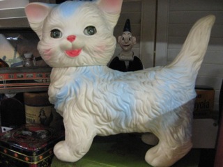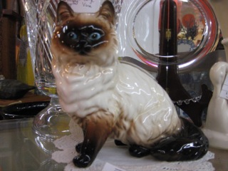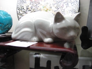 A wonderful porcelain cat on a wooden pedestal is available from Dealer #65.