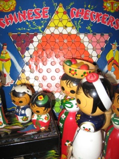 The beauty of Chinese checkers is getting everyone to play!! Dealer #84 has this wonderfully graphic board teamed with vintage Japanese Kokeshi dolls in their case.