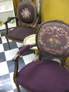 The 'dher' or throne was designed for royalty and the privileged, the chair had arms and was more ornate in construction and design. Dealer #150 has a pair of French Needlepoint armchairs illustrating class status.