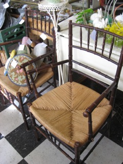 What a great find! The design of the chair continues to evolve with influences from every corner of the world. These black bamboo spindle back armchairs with wood rush seats are very comfortable from Dealer #25. Team with a simple table and you're all set.