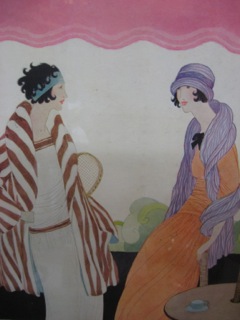 Fashion looks back. Erte had great impact on the fashion world and Dealer #49 has this image of two women in splendid attire. Can't find the look; a vintage dress form is also available to drape your own design!