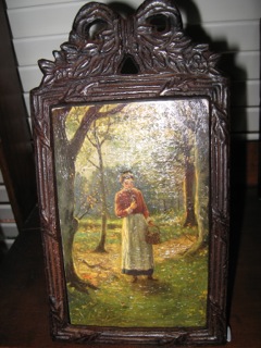 The daily ritual of walking the property and delighting in what Nature bestows upon is beautifully portrayed in this very small scale painting from Dealer #61. Complete with hand carved wooden easel frame.