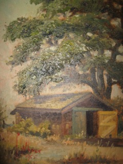 The ground shifts, the paint fades, the barn door gets wear, and the shrubs and trees are flourishing. Rebirth and promise of renewal are featured in this beautifully framed oil painting from Dealer #111.