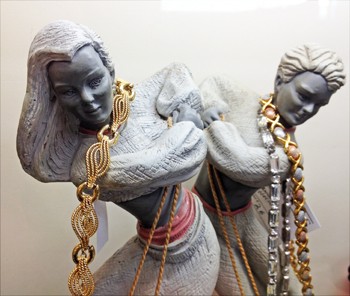We were taken with this display in a showcase at Splendid this week. We think this is a great way to showoff your jewelry at home. Instead of putting it in a jewelry box, why not drape it on figurines like these?