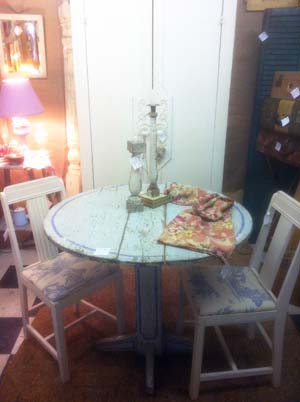 Shopping can be a tiring business so when we see the opportunity to rest, we do it. We came upon this lovely spot in Dealer 35's space. She is selling the vintage table for $160, the chairs are $35 each and the white armoire is only $425.